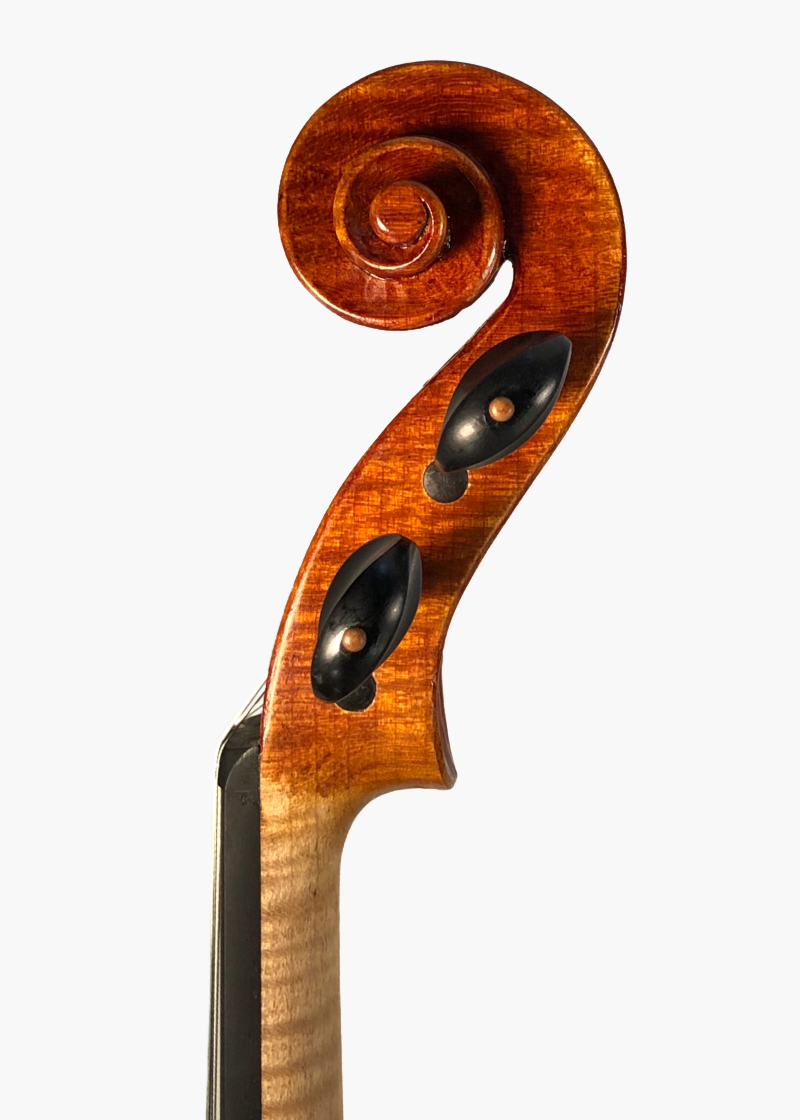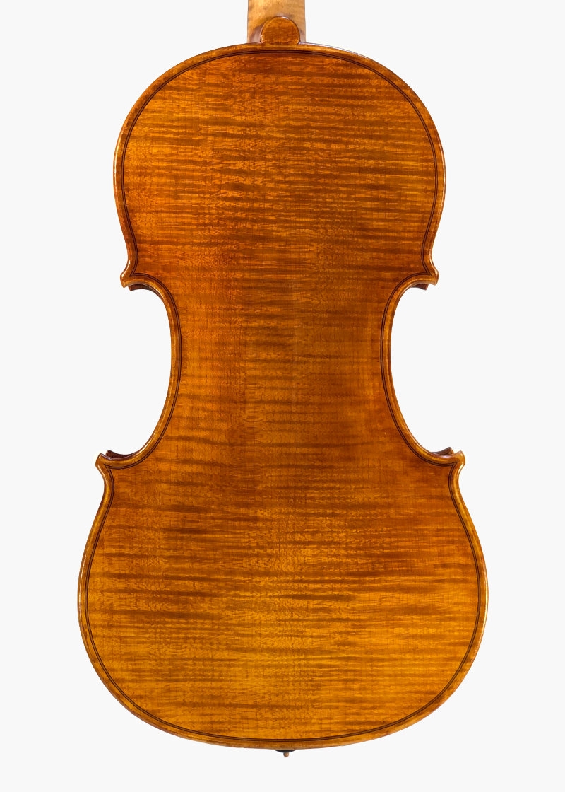 Tapa en abeto con venatura regular. Fondo de arce de una pieza con veteado profundo y descendente de izquierda a derecha. Fajas y mango del mismo material. Instrumento barnizado al alcohol con efecto envejecido.